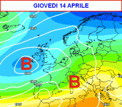 L’azione delle correnti nord africane, scaturite dall’arenamento di una depressione sul vicino Atlantico, si interromperà nella giornata di giovedì 14 aprile (prima cartina a lato).
