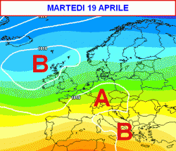 La seconda cartina ci mostra la situazione attesa in Italia nella giornata di martedì 19 aprile. In questo frangente verrà interessato soprattutto il meridione e parte del centro, quasi affatto il settentrione che risulterà più protetto da una zona anticiclonica oltre le Alpi, Il contesto termico resterà molto mite per il periodo.