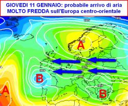 L’alta pressione sulla Scandinavia, oltre a spezzare il getto e a deviarne una parte verso il Mediterraneo (con ingressi dalla Penisola Iberica), potrebbe catturare aria molto fredda dalla vicina Russia e scaraventarla sull’Europa centrale tramite gelidi venti da est.