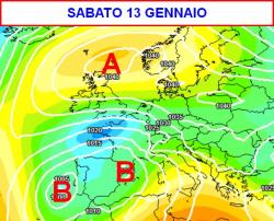 Queste dinamiche, denominate da "interazione", spesso lasciano in eredità una profonda depressione in sede iberica, così come ipotizzato dal modello europeo per sabato 13 gennaio (seconda mappa).