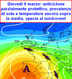da giovedì 9 a domenica 12 marzo: tempo un po’ variabile con passaggi nuvolosi ma con fenomeni sporadici, limitati quasi esclusivamente alle estreme regioni meridionali, in un contesto molto mite al nord-ovest per influsso favonico, relativamente mite al nord-est e al centro, più fresco al sud.