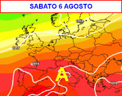 La mappa previsionale valida per sabato 6 agosto ci mostra una vasta zona di alta pressione che abbraccia tutta l’Italia, il Bacino del Mediterraneo e una buona parte dell’Europa centrale (seconda mappa).