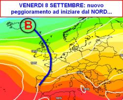 Provando a spingerci oltre e arrivando a venerdì 8 settembre (seconda mappa), una perturbazione si approssimerà dalla Francia con il chiaro intento di interessare le nostre regioni, quantomeno il settore centro-settentrionale italico.