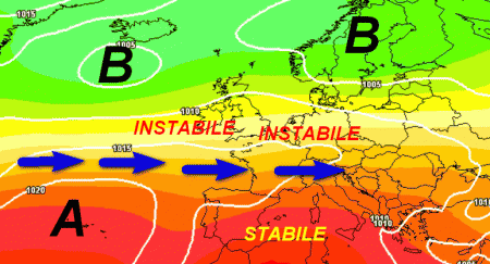 La fascia della stabilità si abbasserà di latitudine; sulle regioni settentrionali il tempo diverrà variabile, a tratti anche instabile con il rischio di qualche temporale specie sulle Alpi e in parte sulle pianure del nord.