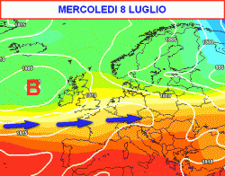 A partire da mercoledì 8 luglio (seconda figura a lato), il flusso occidentale atlantico tenderà ad abbassarsi di latitudine, interessando quantomeno le regioni settentrionali e parte di quelle centrali con qualche temporale e un lieve calo delle temperature massime.