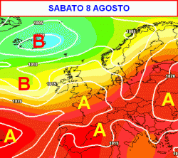 La cartina sinottica valida per sabato 8 agosto ci mostra un oceano di rosso che interesserà non solo l’Italia, ma anche il Mediterraneo oltre ai Paesi prospicienti. Le perturbazioni colme di aria fresca ed instabile transiteranno molto a nord, alle latitudini delle Isole Britanniche e la Scandinavia.