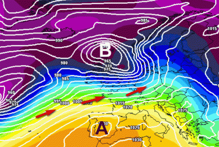 Ne conseguirebbero attacchi a ripetizione dei vortici depressionari alla nostra Penisola con maltempo in rapido trasferimento da nord a sud, piogge, nevicate a quote basse e sbalzi termici sino alla fine di gennaio, come mostra la mappa qui sotto prevista per martedi 19 gennaio: