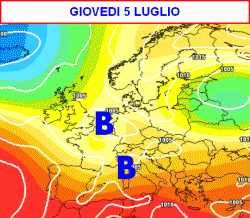 I primi temporali al nord saranno probabili già nel pomeriggio di mercoledi 4 luglio, ma sarà tra giovedì 5 e venerdì 6 luglio (terza mappa) che la saccatura darà il meglio di se sulle regioni settentrionali e parte del centro a suon di temporali e rovesci.