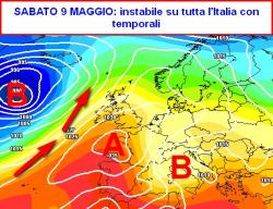 RIASSUMENDO: Sabato 9 e domenica 10 maggio tempo instabile su tutta l’Italia con rovesci o temporali in marcia dalle regioni settentrionali verso il centro-sud, consistente diminuzione delle temperature. Lunedì 11 e martedì 12 maggio ancora un po’ instabile e fresco lungo il versante adriatico e al meridione, per il resto condizioni migliori e con temperature in aumento ad iniziare da ovest. Mercoledì 13, giovedì 14 e venerdì 15 maggio bel tempo e caldo su tutta la nostra Penisola, specie al centro-nord.
