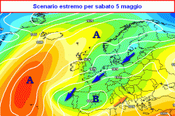 Le precipitazioni più consistenti il modello le individua sia per lunedì 30 aprile, che per mercoledì 2 maggio, ma ci sono anche scenari estremi che tracciano configurazioni bariche rare per il periodo, con l’aria fredda pronta a rientrare da nord-est sin sul centro Europa e l’anticiclone a puntare sulla Scandinavia.