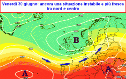 sabato 1° luglio: migliora al nord-ovest, residui temporali pomeridiani al nord-est, zone interne del centro, qualche spunto temporalesco anche al sud; temperature in aumento al nord-ovest, in moderato calo altrove.