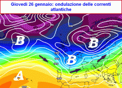 tra giovedì 26 e venerdì 27 transito di un veloce impulso da ovest con molte nubi al nord e al centro, qualche precipitazione su Liguria, arco alpino, nord-est e regioni tirreniche, neve sino alle quote medie sulle Alpi, parzialmente nuvoloso ma asciutto al sud.