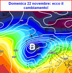 domenica 22 e lunedì 23 novembre: il peggioramento dovrebbe concretizzarsi entro domenica sera a partire dal nord e dalle regioni centrali tirreniche, Sardegna e Umbria con piogge, rovesci, anche qualche temporale sulle coste, neve sulle Alpi oltre i 1600-1800m, con fenomeni in estensione al resto del centro ed alla Campania entro lunedì. Calo delle temperature.