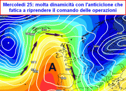 mercoledì 25 novembre: al nord variabilità ma con pochi fenomeni, ancora ventoso e piuttosto freddo, specie in montagna, schiarite anche su centrali tirreniche e Sardegna, instabile su medio Adriatico e meridione con rovesci sparsi, qualche temporale e brevi nevicate in Appennino oltre i 1200m.