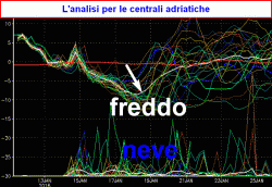ANALISI CENTRALI ADRIATICHE: si nota la veloce e modesta passata precipitativa del 14-15, poi la vistosa diminuzione delle temperature, vista da pressoché tutti gli spaghetti, cioè da tutte le corse alternative del modello americano. A questo vistoso calo si accompagnerà anche qualche precipitazione nevosa che naturalmente qui viene vista a
