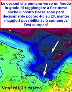 L’ipotesi, pur mostrata anche in modo spettacolare dalla corsa di controllo del modello americano, non può essere al momento avallata, poiché compare peraltro solo in 4-5 corse su 20 del modello stesso e solo alcune delle rimanenti 15 mostrano il freddo raggiungere l’est europeo.
