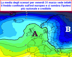 La media degli scenari propende così inevitabilmente per un freddo che rimanga ai nostri confini, ammesso ma ancora non accesso che venga poi confermato anche lì.