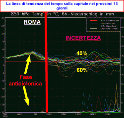 La corsa ufficiale è rappresentata dalla linea verde. Le linee a metà grafico sono le temperature a 1500 metri di quota e la linea rossa è la media. I picchi che si notano più in basso sono invece le precipitazioni. Più i valori sono alti, più le piogge (o le nevicate) sono probabili e intense. Il punto geografico di riferimento è situato grossomodo sulla verticale di ROMA.