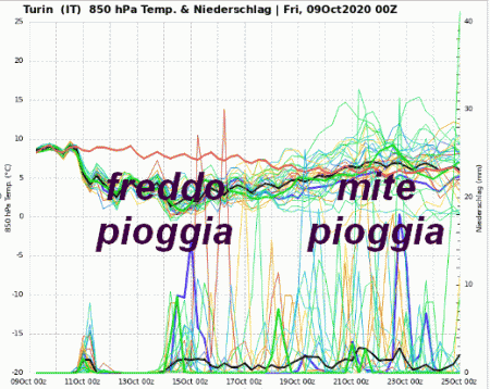 Ottobre autunnale a tutti gli effetti, anzi più a tinte tardo autunnali. Non è solo una questione di maltempo, ma di freddo. Finiremo sotto la media per diversi giorni e sperimenteremo precipitazioni, poi quando le temperature risaliranno seguiterà a piovere su diverse regioni. Lo si vede molto bene nel grafico degli "spaghetti" riferito a TORINO, prima il freddo e le piogge, poi dal 18-19 ancora precipitazioni ma in un contesto decisamente più mite: