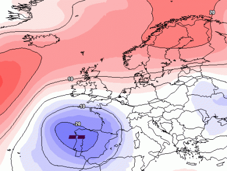 Più o meno questa è la sorte che toccherà a gran parte d’Italia, tranne al sud, dove la seconda fase potrebbe essere analogamente mite ma non piovosa, giacché il meridione finirebbe per risentire dell’influenza di un piccolo cuneo anticiclonico, che si posizionerà davanti al vortice depressionario che vedete parcheggiato sull’Iberia tra sabato 17 e martedì 20 ottobre (viene espresso come anomalia barica con doppio segno – a 5500m):