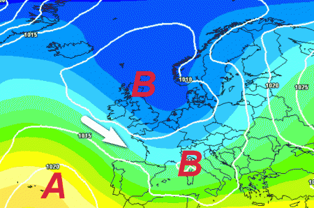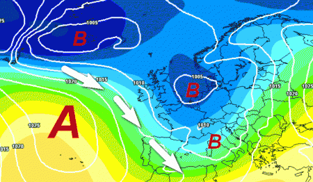 L’alta pressione sara presente in Atlantico e farà da scivolo alle correnti fredde di matrice polare (frecce bianche) verso il bacino centro-occidentale del Mediterraneo.