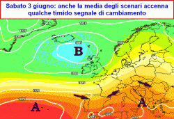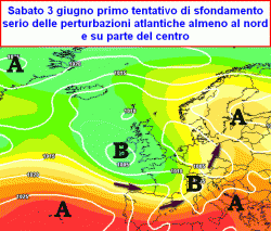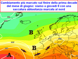 da martedì 6 giugno a giovedì 8 giugno: possibile maggiore affondo delle saccature atlantiche con risvolti temporaleschi al nord, forse estesi anche alle pianure, in particolare a nord del Po, temperature in calo al nord, da giovedì 8 possibile coinvolgimento anche del centro, segnatamente di Toscana, Umbria e Marche.