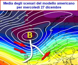 La prima mappa è la media di tutti gli scenari del modello americano valida per mercoledi 27 dicembre. Si nota l’approccio di una vasta depressione che sarà foriera di maltempo al nord e al centro nelle giornate seguenti.