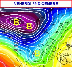 Il contesto termico non sarà molto freddo, ma il tempo potrebbe presentare carattere di notevole perturbabilità sull’Italia, specie tra giovedì 28 e venerdì 29 dicembre (seconda mappa).