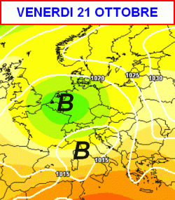 La prima mappa inquadra la situazione attesa in Italia per la giornata di venerdì 21 ottobre.