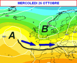 La mappa prevista per mercoledì 26 ottobre mostra l’alta pressione defilata in oceano, oltre al continuo arrivo di correnti fresche ed instabili dal nord Atlantico (frecce blu).