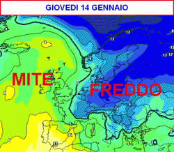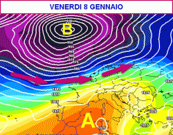 La prima cartina ci mostra la situazione prevista in Italia e in Europa nella giornata di venerdì 8 gennaio.