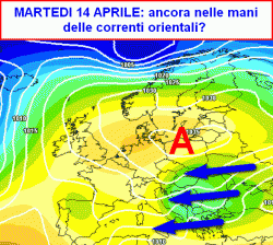 La cartina valida per martedì 14 aprile (siamo nel lunghissimo termine) seguita a mostrarci correnti orientali sulla nostra Penisola, indotte da un’alta pressione in posizione anomala sull’Europa nord-orientale.