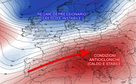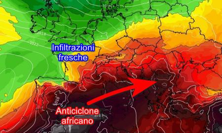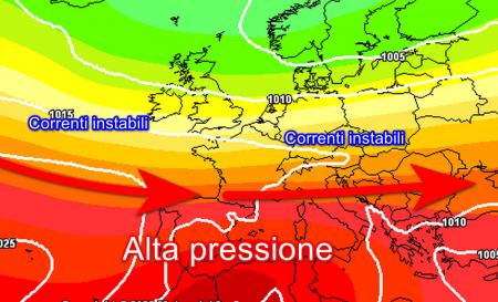 A lungo andare la copertura anticiclonica si dimostrerà più vacillante sulle regioni settentrionali, dove potrebbero verificarsi alcuni intensi temporali. Queste manifestazioni temporalesche sarebbero provocate da infiltrazioni d’aria più fresca oceanica al sud dell’arco alpino.