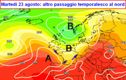 martedì 23 agosto: al nord instabile con temporali sparsi, anche forti, qualche fenomeno anche tra Toscana e Marche, temperature in calo tra nord e nelle zone coinvolte dai temporali al centro, ancora sole e caldo altrove.