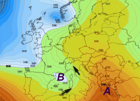 Una spina nel fianco dell’alta pressione, questa bell’ansa depressionaria che ci autorizza a pensare che da qui potrebbero scaturirne precipitazioni anche abbondanti sui versanti occidentali del Paese.