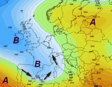 Certo, non siamo ancora alla certezza, ma l’evoluzione da ovest è la più facile da prevedere per i modelli e dunque ci autorizza a pensare che questa potrebbe essere la configurazione barica giusta per l’esordio di maggio, guardiamola insieme: