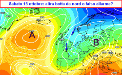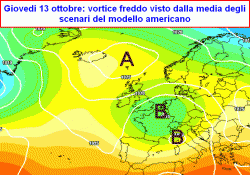 Tornando però ad interrogarsi sul futuro atmosferico in modo più razionale e saggio, il modello americano propone il suo cavallo di battaglia: un’azione più tranquillizzante e tradizionale da ovest, con l’aria fredda che andrebbe ad alimentare alcuni vortici in arrivo dall’Atlantico e a spedirli verso il centro del Continente e di striscio anche nel Mediterraneo, apportandovi variabilità e qualche precipitazione in un contesto termico più mite e consono alla metà di ottobre.
