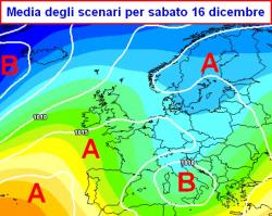Una metà dicembre all’insegna dal maltempo e del vero inverno, dopo le stagioni fredde "stempiate" degli anni scorsi. Notate l’alta pressione molto defilata ad ovest che con la sua spalla farà da scivolo a correnti fredde settentrionali in ingresso sul Mediterraneo centro-occidentale.