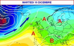 Volgendo lo sguardo ulteriormente a prua e arrivando alla fine della seconda decade (la terza mappa è valida per martedì 19 dicembre) si nota una certa spinta delle correnti atlantiche con un parziale coricamento dell’alta pressione sull’Europa centro-settentrionale.
