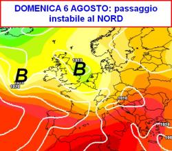 Arriveremo così al primo week-end agostano con il probabile transito di una saccatura sull’Italia settentrionale associata a temporali e un calo delle temperature (terza mappa).