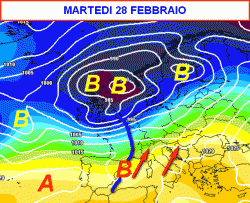 La prima mappa inquadra la situazione prevista in Italia per martedì 28 febbraio. E’ evidente l’approccio di una moderata perturbazione da ovest che farà cambiare il tempo in Italia ad iniziare dalle regioni settentrionali.