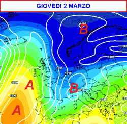 A seguire è atteso un peggioramento più consistente, soprattutto al nord e al centro. La mappa attesa per giovedì 2 marzo mostra una situazione decisamente perturbata; in questo frangente si avrebbe anche un abbattimento della quota neve al centro-nord stante il calo dei geopotenziali in quota unitamente ad una diminuzione termica.