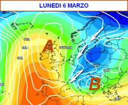 La mappa relativa a lunedì 6 marzo mostra proprio l’evoluzione sopra descritta: l’alta pressione si ergerà a muro facendo affluire correnti fredde di matrice settentrionale verso il Bel Paese. Oltre il calo del limite della neve al centro-sud avremo una drastica diminuzione termica sotto un clima molto ventoso.