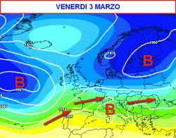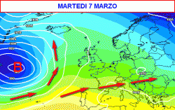 Da notare i due mastini depressionari (il primo sul Vicino Atlantico e il secondo sull’Europa orientale) facenti da contro altare alla pressione relativamente alta presente alle basse latitudini mediterranee.