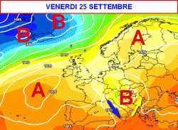 A puro titolo informativo, ecco la cartina sinottica valida per venerdì 25 settembre. Inutile al momento sottilizzare sull’esatta posizione dei centri motori del tempo in Europa. Tuttavia osservando la mappa, si indovina una circolazione di bassa pressione che potrebbe coinvolgere non solo la nostra Penisola, ma buona parte dei Paesi dell’Europa centro-orientale.