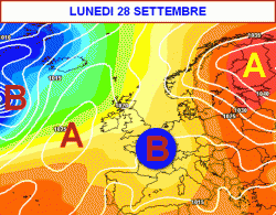 Se con un balzo virtuale ci spostiamo a lunedì 28 settembre, notiamo una situazione ancora governata da una vasta struttura depressionaria.