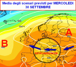 La prima cartina a lato rappresenta la media degli scenari contemplati dal modello americano per la giornata di mercoledì 30 settembre.