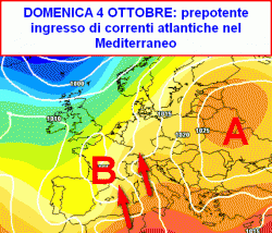 Se con un balzo virtuale ci proiettiamo a domenica 4 ottobre, notiamo una vasta saccatura atlantica che si insedierà nel bacino centro-occidentale del Mediterraneo.