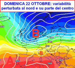 La prima mappa valida per domenica 22 ottobre mostra una veloce perturbazione che agirà al nord e su parte del centro con qualche pioggia; al meridione situazione ancora asciutta e anche abbastanza calda stante la persistenza dell’alta pressione.