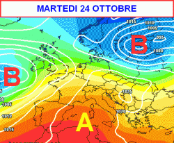 La seconda mappa, valida per martedì 24 ottobre, mostra due zone depressionarie ai lati e un blando anticiclone nel mezzo.